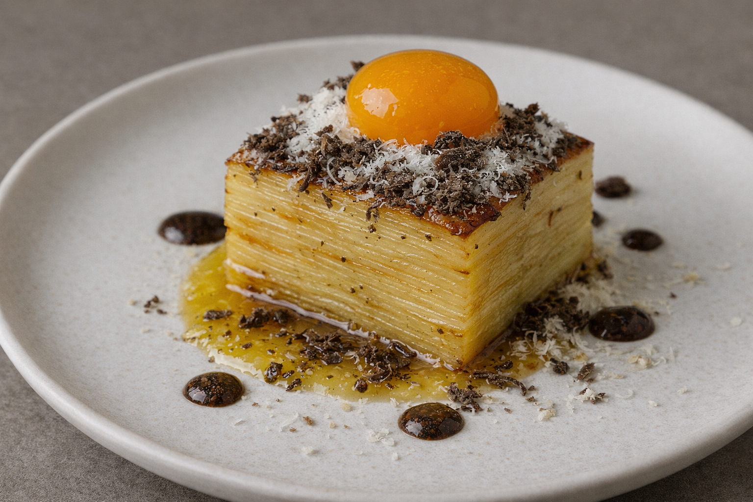 Milhoja tibia de patata confitada con parmesano, trufa negra y yema...
