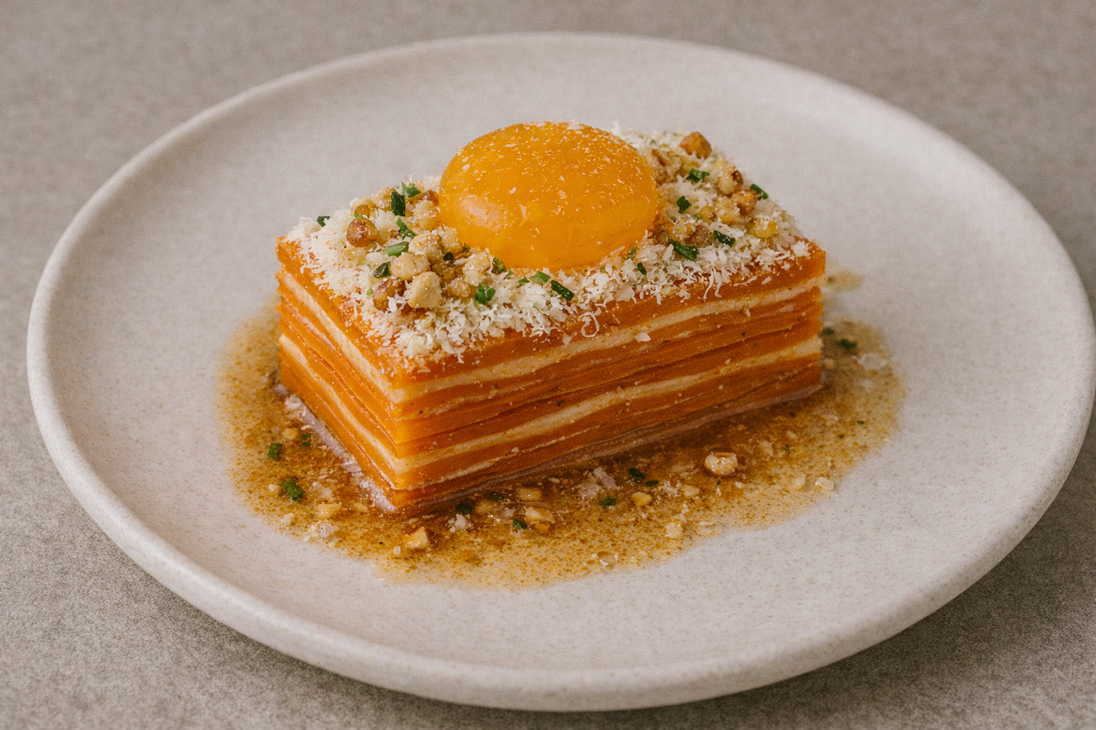 Milhoja tibia de batata naranja confitada con mantequilla avellana,...