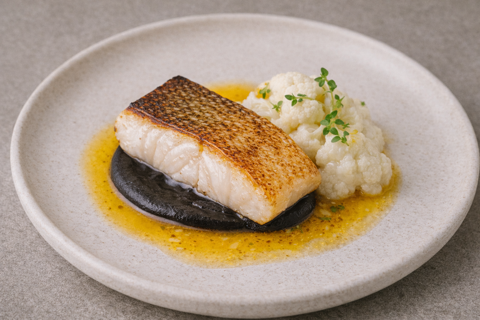 Lomo de corvina con crema suave de ajo negro, coliflor sedosa y jug...