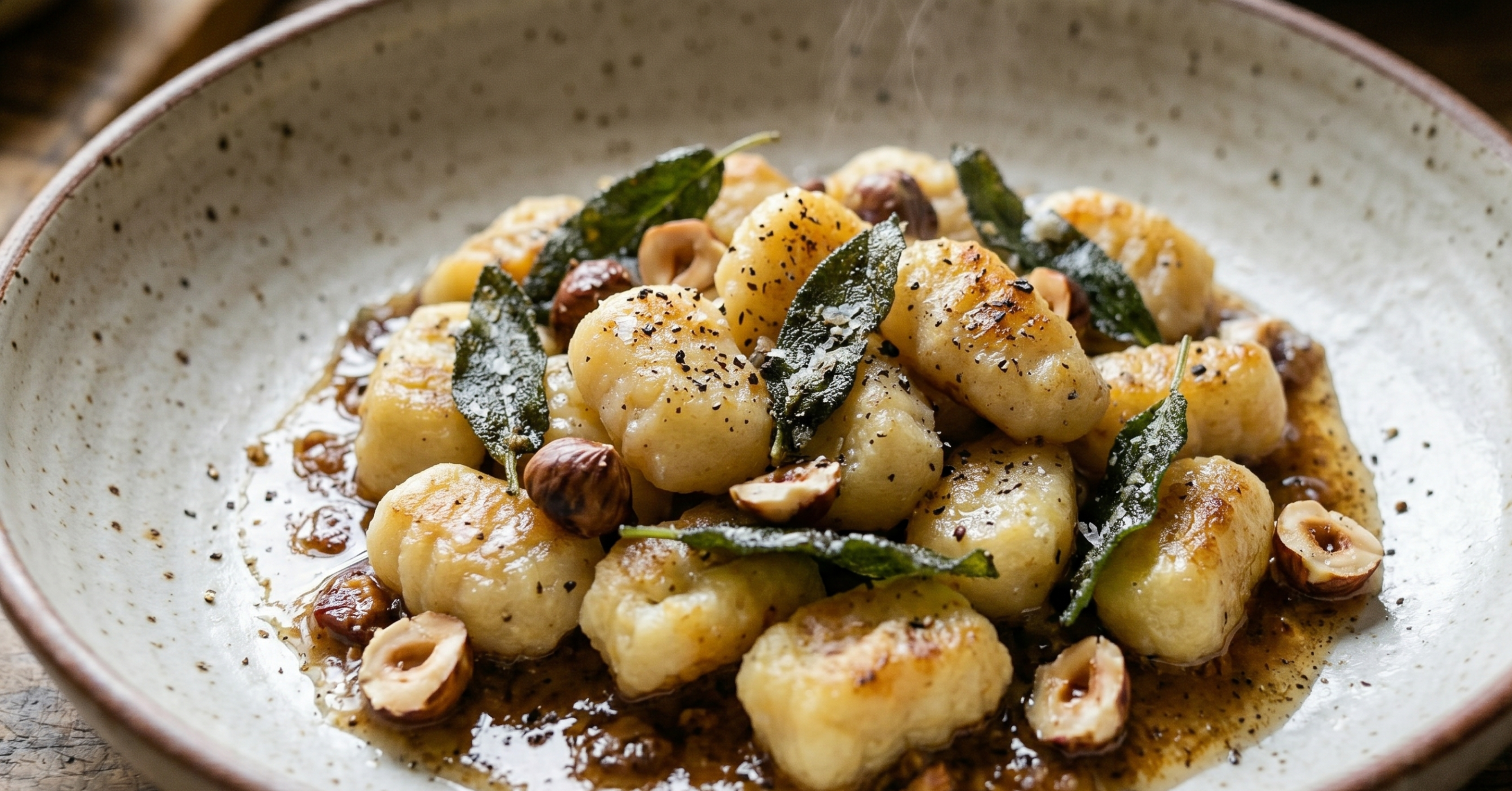 Gnocchi invertidos de patata con mantequilla tostada, salvia y avel...